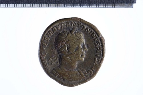 Busto laureato e corazzato di Elagabalo a d., di tre quarti in avanti; contorno perlinato.