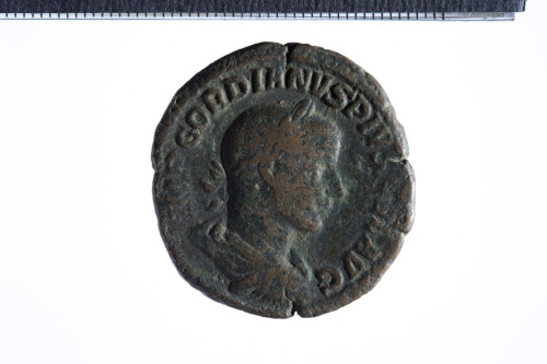 Busto laureato di Gordiano III a d. con corazza e paludamentum, di tre quarti di spalle; contorno perlinato.