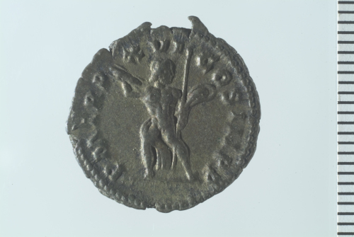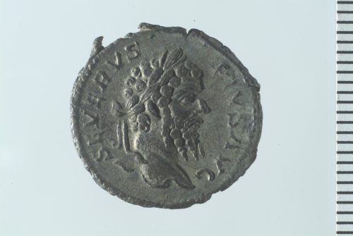 Testa laureata di Settimio Severo a d.; contorno perlinato.