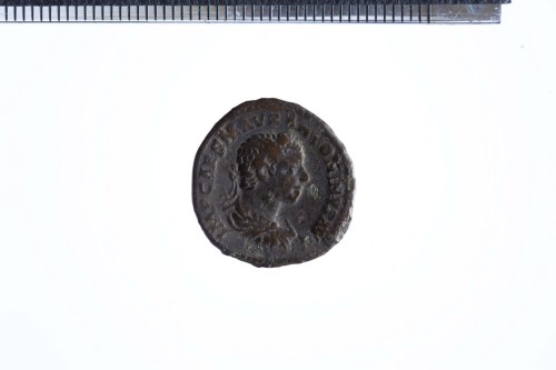 Busto laureato di Elagabalo a d., con paludamentum, di tre quarti di spalle; contorno perlinato.
