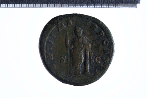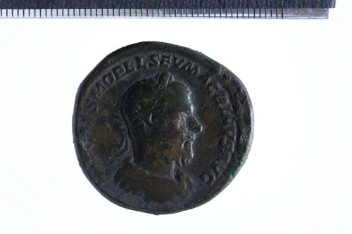 Busto laureato di Macrino a d. con corazza e paludamentum, di tre quarti in avanti; contorno perlinato.