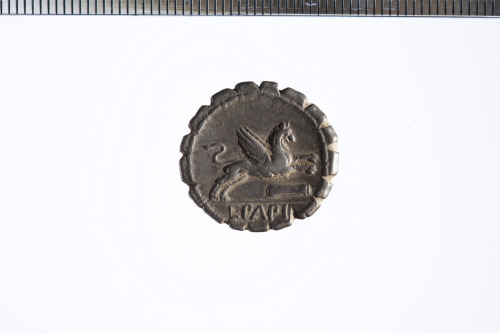 Testa di Giunone Sospita a d.; dietro, simbolo che si avvicina al tipo Crawford pl. LXVI, n. 82; cerchio di astragali.