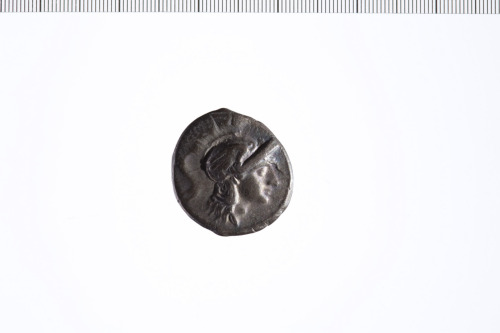 Testa di Atena con elmo corinzio a d.