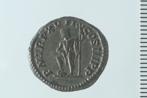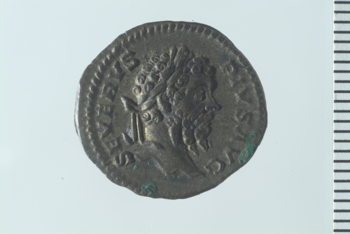 Testa laureata di Settimio Severo a d.; contorno perlinato.