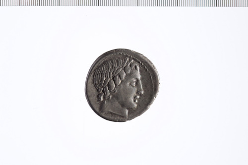Testa di Apollo con ghirlanda a d.; sotto fulmine. Cerchio perlinato.