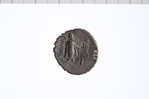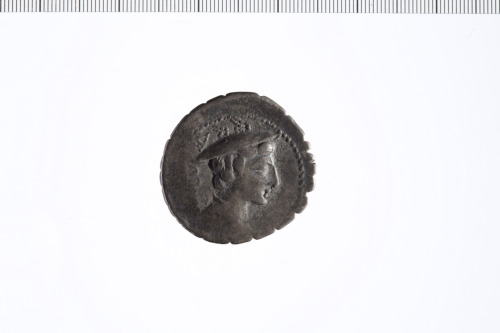 Busto di Mercurio a d. drappeggiato e con caduceus sulla spalla; dietro lettera illeggibile. Cerchio perlinato.