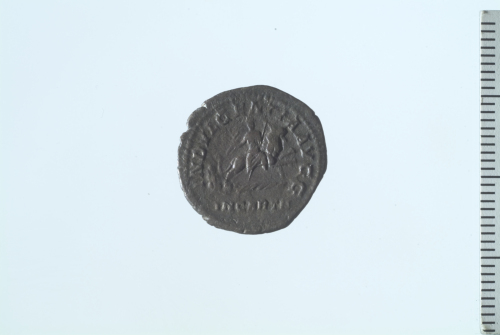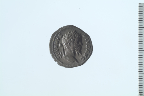 Testa laureata di Settimio Severo a d.; contorno perlinato.
