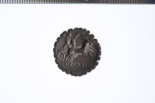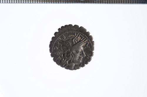 Testa di Roma a d. con elmo attico, dietro simbolo di valore X