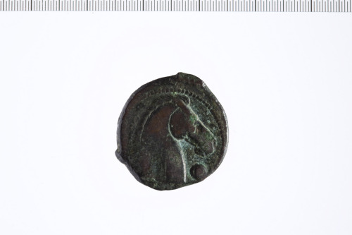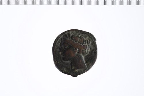 Testa di Tanit a s. con corona di spighe di grano e semplice collana. Contorno perlinato.