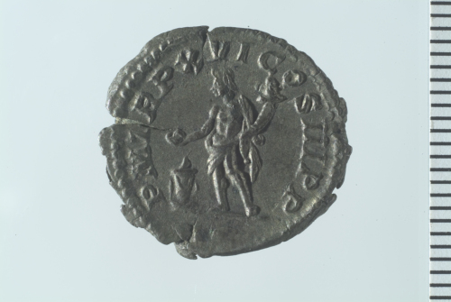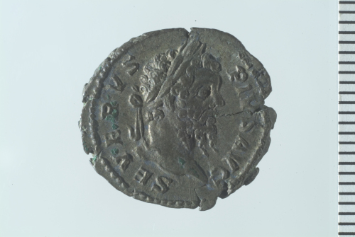 Testa laureata di Settimio Severo a d.; contorno perlinato.
