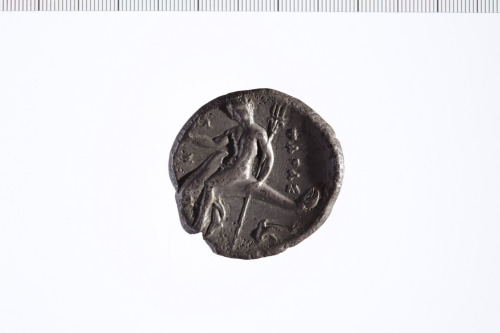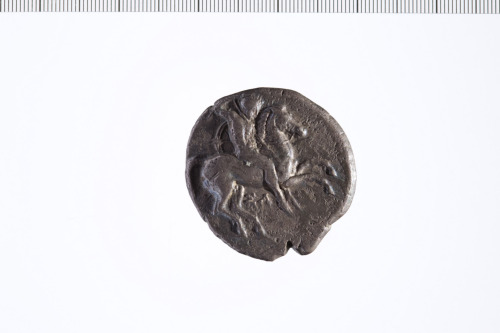Cavaliere su cavallo a d. con lancia in mano e scudo appeso dietro la schiena.