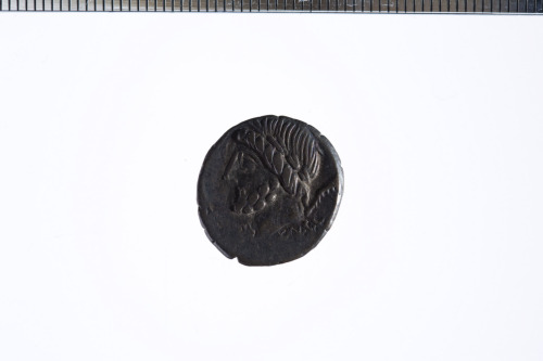 Testa laureata di Saturno a s.; dietro , harpa; c.p.