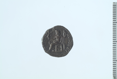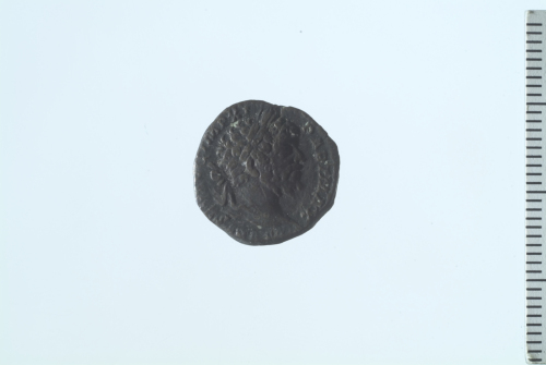 Testa laureata di Settimio Severo a d.; contorno perlinato.