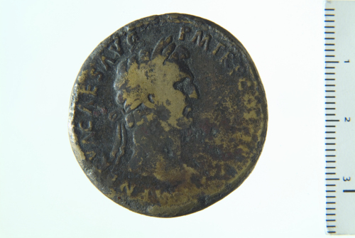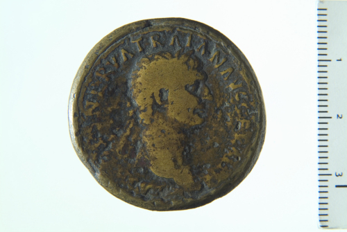 Testa laureata di Traiano a d.; contorno perlinato.