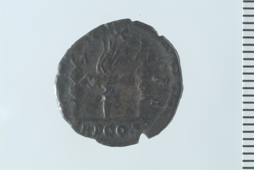 Testa laureata di Settimio Severo a d.; contorno perlinato.