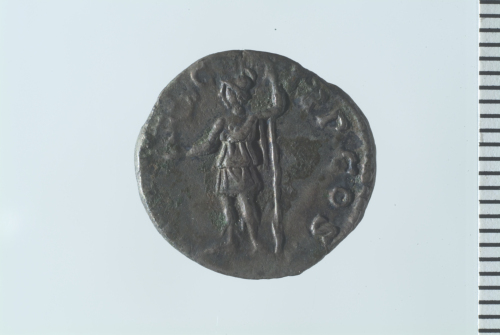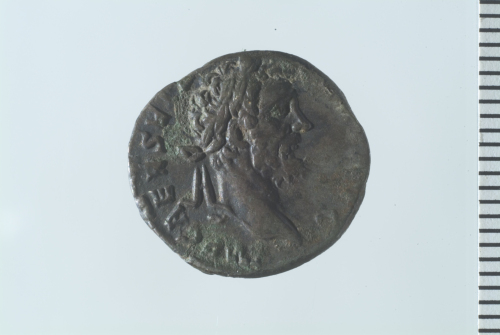 Testa laureata di Settimio Severo a d.; contorno perlinato.