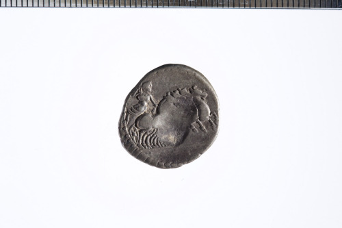 Testa con corona di quercia di Apollo a d.; sotto, un fulmine; c.p.