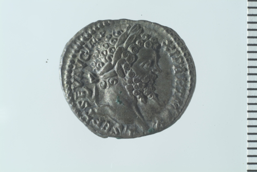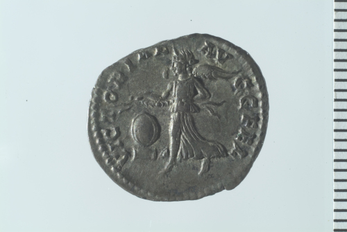 Testa laureata di Settimio Severo a d.; contorno perlinato.
