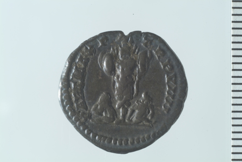 Testa laureata di Settimio Severo a d.; contorno perlinato.