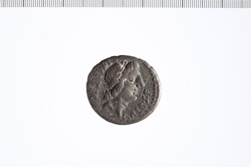 Testa laureata di Apollo a d. Contorno perlinato.