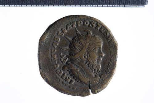 Busto radiato, drappeggiato e corazzato di Postumo a d.; contorno perlinato