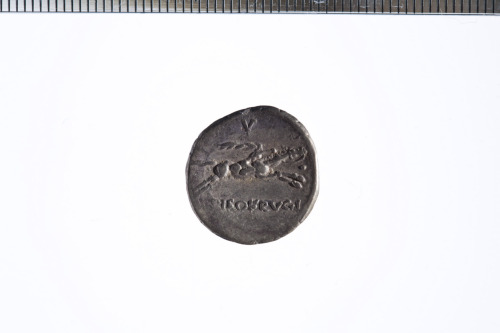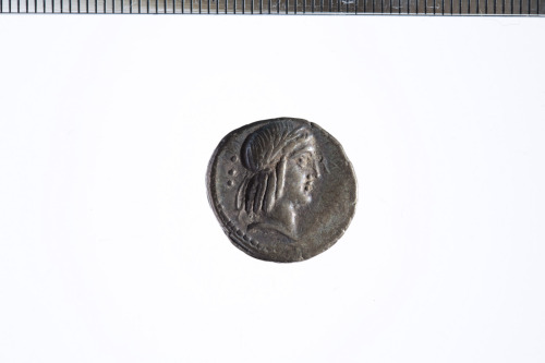Testa laureata di Apollo a d. con i capelli fermati da un nastro. Bordo perlinato.