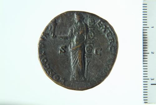 Busto laureato di Antonino Pio a d., con corazza e paludamentum; contorno perlinato.