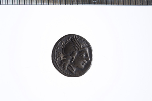 Testa galeata di Roma a d. con elmo alato; c.p.
