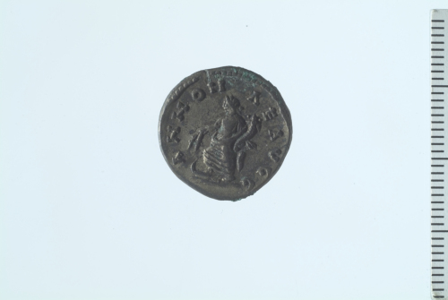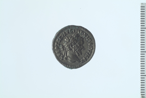 Testa laureata di Settimio Severo a d.; contorno perlinato.