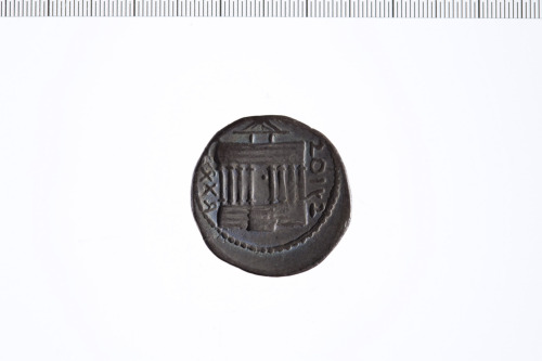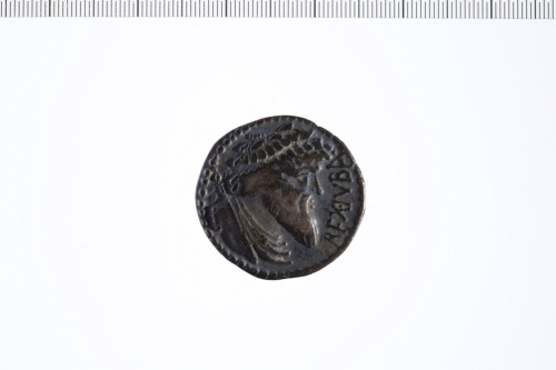 Busto di Juba drappeggiato a d., con barba, capelli a riccioli lunghi. Diadema, scettro sulla spalla. Contorno lineare.