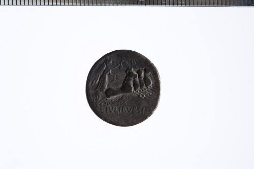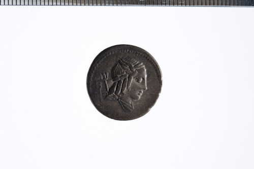 Testa maschile a d. laureata, con le ali e con dietro un tridente (attributi di Apollo, Mercurio e Nettuno); dietro come simbolo di controllo, un caduceo; c.p.