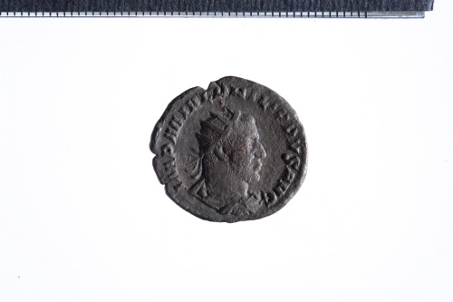 Busto radiato di Filippo I a d., con corazza e paludamentum, di tre quari di spalle; contorno perlinato.