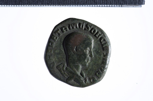 Busto a testa nuda di Herennio Etrusco a d., con corazza (?) e paludamentum, di tre quarti di spalle; contorno perlinato (?).
