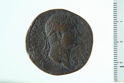 Testa laureata di Adriano a d.; contorno perlinato.