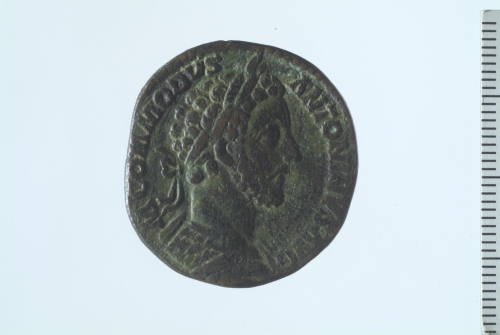 Busto laureato e corazzato di Commodo a d.; contorno perlinato; contorno perlinato.