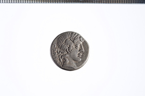 Testa laureata di Apollo a d.; non si vede il simbolo davanti la testa; c.p.