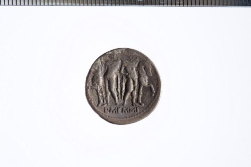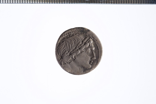 Testa di un giovane coronata da una corona di quercia a d. (Apollo?); sotto al mento, un asterisco che in questo esemplare non si legge; c.p.
