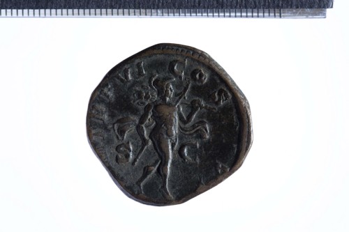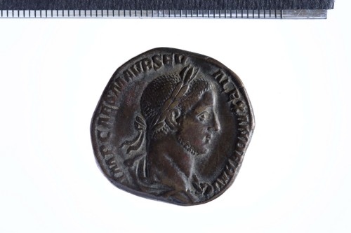 Busto laureato di Alessandro Severo a d. con paludamentum, di tre quarti di spalle; contorno perlinato.