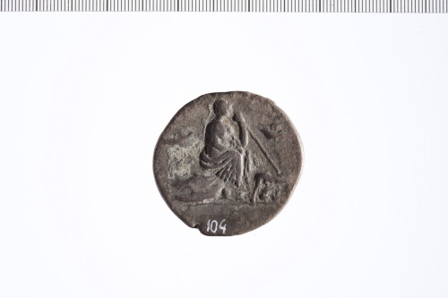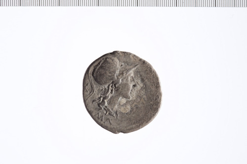Testa elmata di Roma a d. con elmo corinzio e ricciolo sulla spalla s. Contorno perlinato.