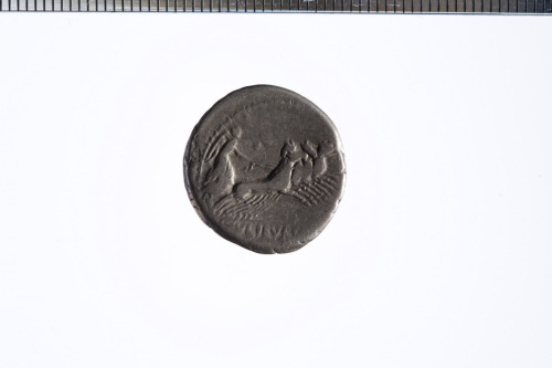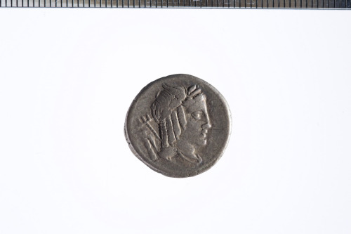 Testa maschile a d. laureata, con le ali e con dietro un tridente (attributi di Apollo, Mercurio e Nettuno); dietro come simbolo di controllo, un aspergillum; c.p.
