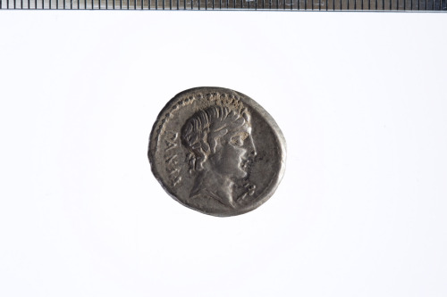 Testa laureata di Apollo a d.; sotto il mento un trofeo; c.p.