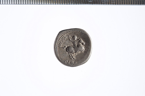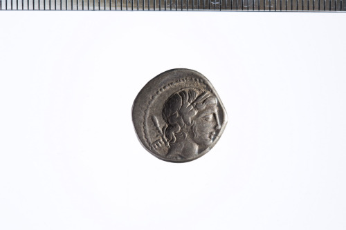 Testa laureata di Apollo? a d. con dietro uno scettro; davanti un simbolo non meglio identificabile; c.p.
