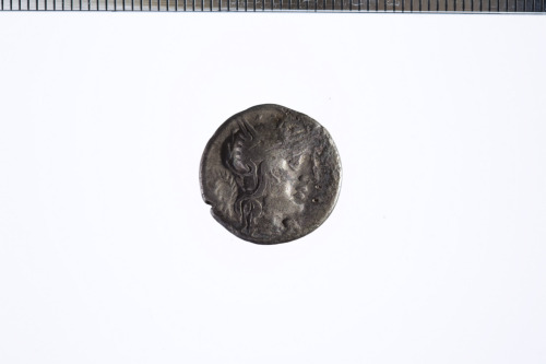 Testa elmata di Roma a d., dietro corona, davanti sotto il mento X barrato, c.p.
