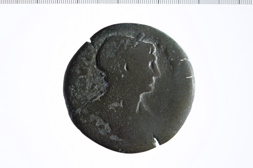 Busto laureato di Traiano a d., paludato, corazzato, di tre quarti, in avanti.
