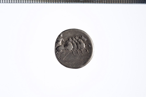 Testa con corona di quercia di Apollo a d.; sotto, un fulmine; c.p.