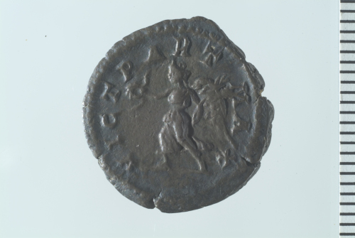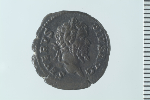 Testa laureata di Settimio Severo a d.; contorno perlinato.