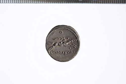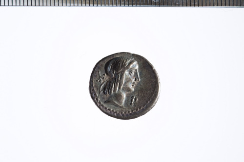 Testa laureata di Apollo a d. con i capelli fermati da un nastro. Bordo perlinato.