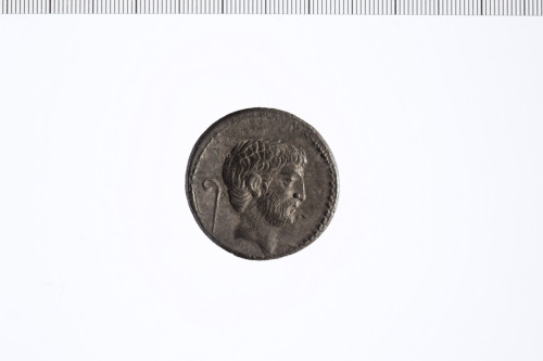 Testa barbata di Marco Antonio a d., a s. lituus. Bordo perlinato.