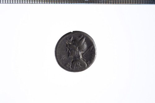 Busto di Roma a s. con elmo piumato e scudo nella s., con la d. regge lancia posata sulla spalla d.; sopra crescente, davanti simbolo di valore X barrato; c.p.