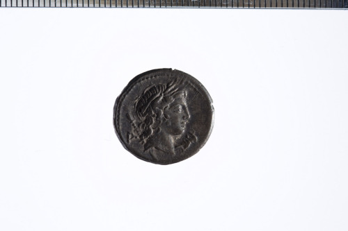 Testa laureata di Apollo? a d. con dietro uno scettro; davanti un simbolo non meglio identificabile; c.p.